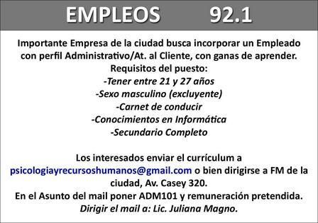 Importante empresa de la ciudad busca incorporar un empleado con perfil administrativo / atención al cliente con ganas de aprender.