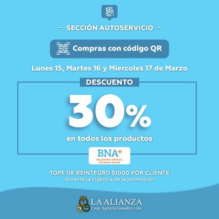 Cooperativa La Alianza, en el Autoservicio de Irigoyen 229 de la ciudad, tiene un tope de reintegro de 1.000 pesos por cliente durante la vigencia de la promo.
