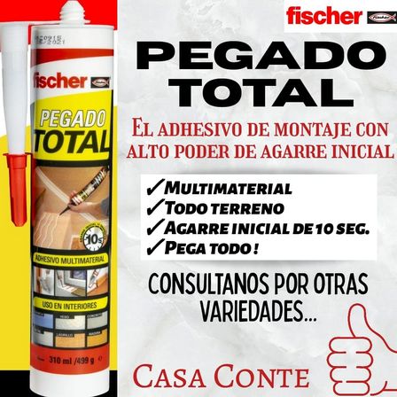 Un adhesivo de la marca Fischer está siendo promocionado por su alto poder de agarra inicial puede encontrarse en Casa Conte.