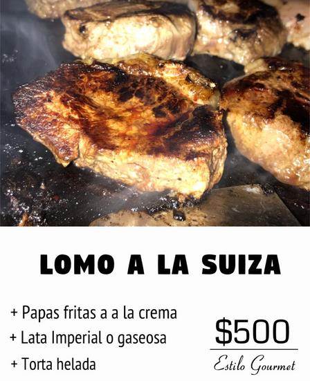 Lomo al champiñon con papas, matambre de cerdo a la mostaza con papas españolas, pollo relleno arrollado con papas a la crema, suprema pastora con papas a la crema y arvejas a la manteca, bife de chorizo con panceta ahumada y papas cheddar, y lomo a la suiza con jamón, queso y morrón acompañado de papas fritas y 2 huevos fritos, son los platos principales.