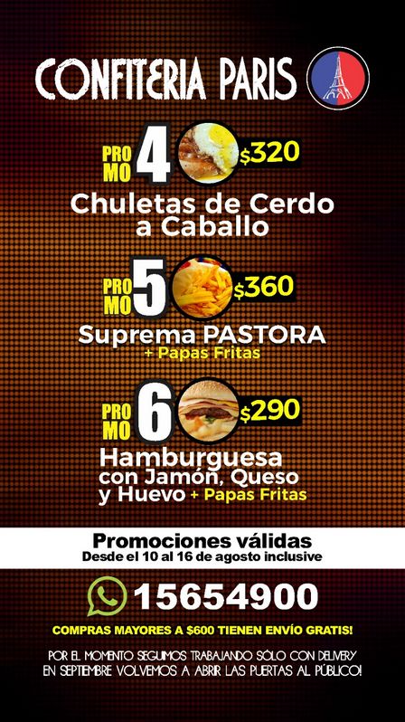 Confitería París tiene opciones en pollo a la pizza, pizzas, hamburpizzas, pizzetas, y empanadas, con pedidos al 2923 65 49 00