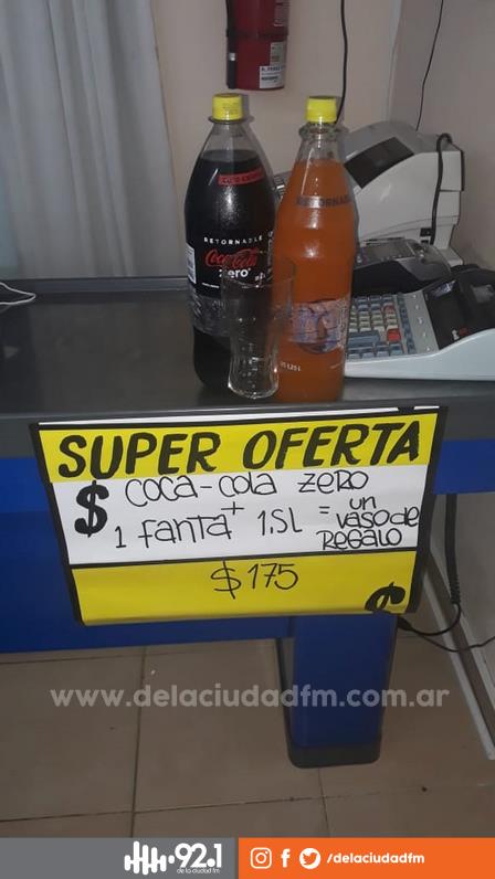 Una botella de Coca Cola Zero de un litro y medio más una Fanta de un litro y medio con un vaso de regalo cuestan 175 pesos en Pellegrini 454 de Pigüé.