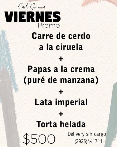 Para el viernes preparan carré e cerdo a la ciruela, papas a la crema, una torta helada y una lata de cerveza Imperial.