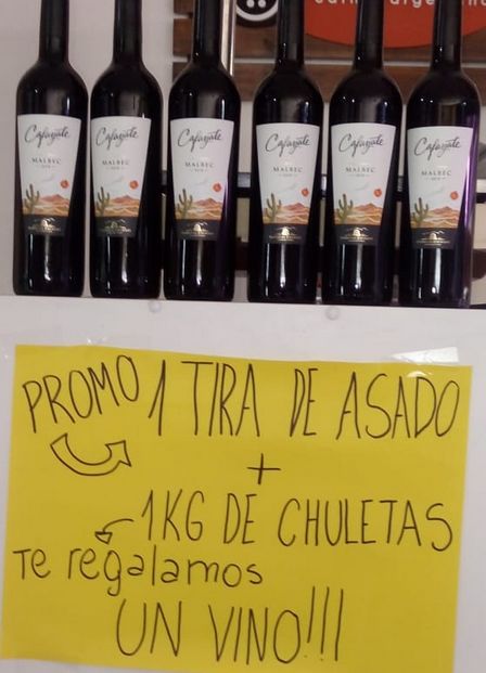 Comprando una tira de asado más un kilo de chuletas de La Raza Carnes hay una botella de vino Cafayate de regalo.