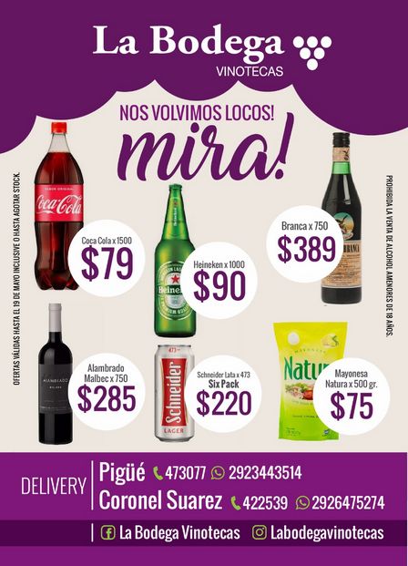 La Bodega Vinotecas destaca el Fernet Branca de 750 mililitros a 389 pesos, la cerveza Heineken de litro a 90 pesos, y la Coca Coca de 1 litro y medio a 79 pesos.