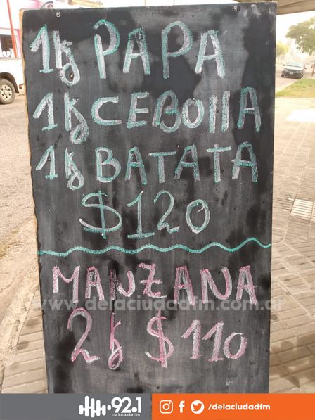 Media Naranja tiene dos kilos de manzanas a 110 pesos y un kilo de cebolla más un kilo de papas más un kilo de batatas a 120 pesos.