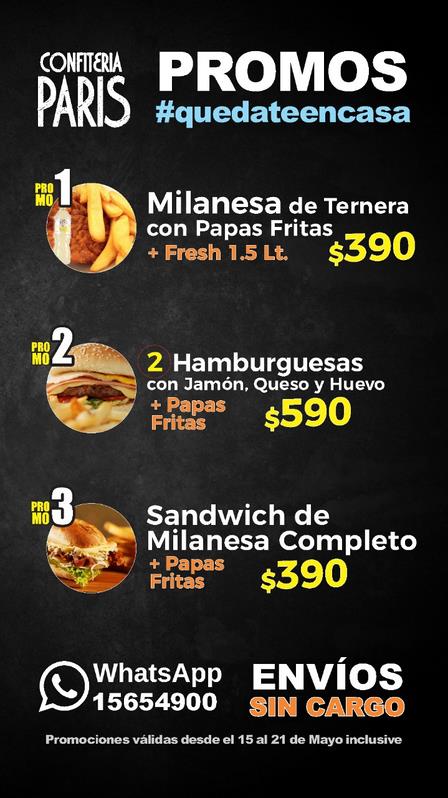 La Promo 1 por 390 pesos incluye una milanesa de ternera con papas fritas más una Fresh de 1 litro y medio, la Promo 2 es de dos hamburguesas con jamón, queso, y huevo más papas fritas a 590 pesos, y la Promo 3 tiene un sándwich de milanesa completo más papas fritas a 390 pesos.