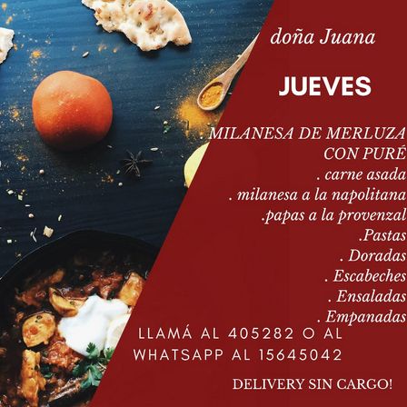 En Doña Juana, este jueves, cocinan milanesas de merluza con puré, carne asada, milanesas a la napolitana, pastas, papas a la provenzal, papas doradas, ensaladas, y empanadas.