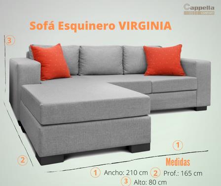 Este sofá esquinero Virginia tiene 2.10 metros de ancho, 1.65 metros de profundidad y 80 centímetros de alto.