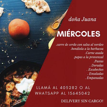 Doña Juana Casa de Comidas prepara hoy carré de cerdo con salsa al verdeo, bondiola a la barbacoa, carne asada, papas a la provenzal, ensaladas, empanadas, y pastas.