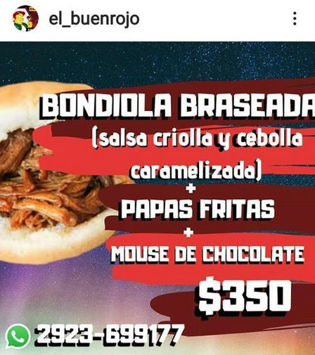 El Buen Rojo prepara para hoy, sábado, bondiola braseada, papas fritas, y mousse de chocolate por 350 pesos.