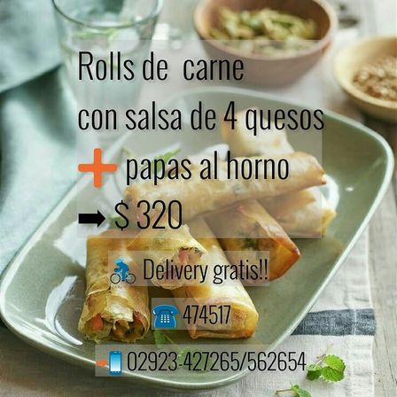 Rolls de carne, con salsa cuatro quesos, más papas al horno es el menú del día miércoles en La Volea.