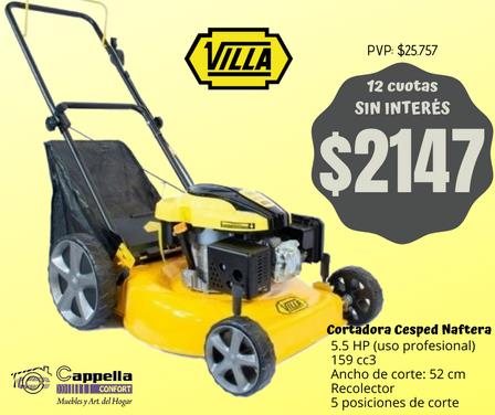 Una cortadora de cesped naftera, de 5.5 HP, para uso profesional, con ancho de corte de 52 centímetros, recolector, y cinco posiciones de corte puede hallarse en 12 cuotas sin interés de 2.147 pesos cada una.