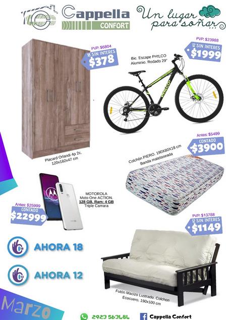 Cappella Confort tiene un celular Motorola Moto One Action a 22.999 pesos, o un placard Orlandi de 4 puertas con 2 cajones en 18 pagos de 378 pesos, y una bicileta Escape Philco en 12 cuotas sin interés de 1.999 pesos.