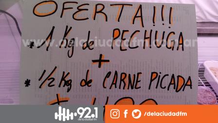 Un kilo de pechuga más medio kilo de carne picada cuestan 400 pesos en el local de La Pampa esquina Lavalle.