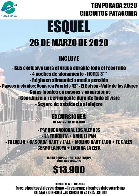 Circuitos Viajes y Turismo prevé una salida por Esquel a 13.900 pesos.