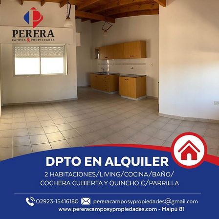 En Alem casi España la vivienda en alquiler cuenta con dos habitaciones, living, cocina, baño, cochera cubierta, y quincho con parrilla.