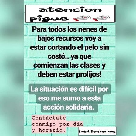 La estilista local que tiene su salón en calle Monseñor Durban 875 de Pigüé afirmó “vamos a estar cortándoles el pelo a los nenes, a todo el que necesite realmente, y no tenga para pagarlo, puede traer al nene o a la nena gratis”.