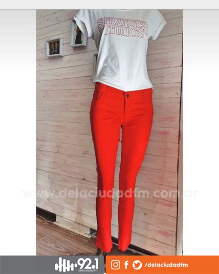 Olivia Indumentaria promociona sus pantalones de gabardina en colores rojo, negro, o verde militar.