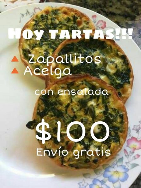 Las tartas de zapallitos y de acelga cuestan 100 pesos con envío gratuito acompañadas de ensaladas.