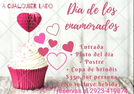 Entrada, plato del día, postre, y copa de brindis, sin bebida, cuesta 350 pesos para el día de hoy en el marco del festejo de San Valentín.
