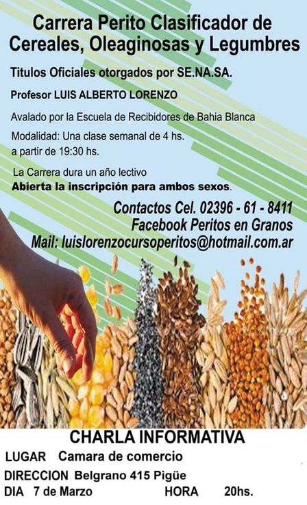 Nuevamente el curso de perito clasificador de granos llegará a la ciudad de Pigüé en unos días más.