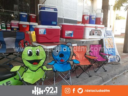 Hay reposeras, sillones, carpas, bolsas de dormir, mochilas, conservadoras y termos.