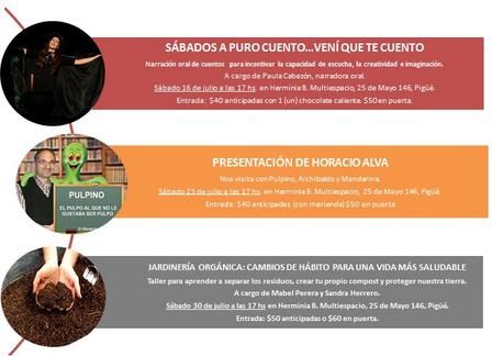 Para el sábado 23 de julio se prepara la visita de Horacio Alva para presentar a Pulpino, Archibaldo, y Mandarina. A su vez, el sábado 30 de julio, Mabel Perera y Sandra Herrero encabezarán un taller de Jardinería Orgánica.