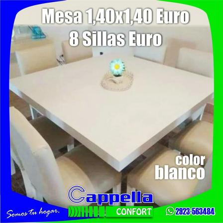 La mesa, de 1.40 metros por 1.40 metros, modelo Euro, viene con 8 sillas color blanco.