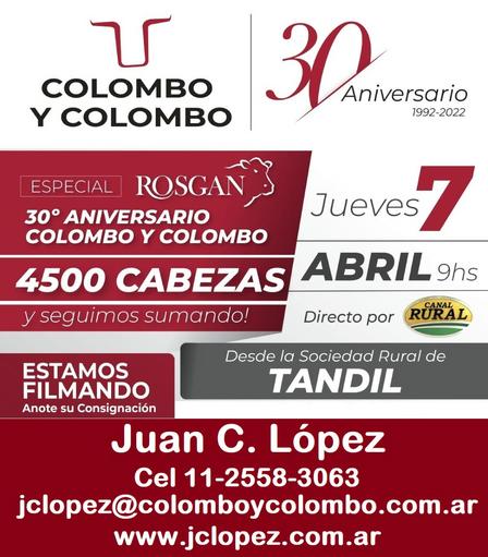 La consignataria festejará su 30° con un Rosgan especial para el 7 de Abril desde la Sociedad Rural de Tandil, con más de 4.500 cabezas anotadas a la fecha, y será transmitido en vivo por Canal Rural. Anote su consignación, seguimos filmando.