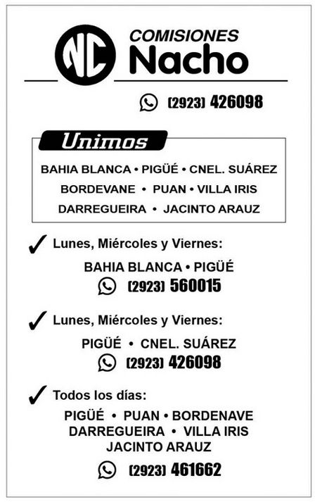 Comisiones Nacho realiza este tipo de gestiones en el tramo Bahía Blanca / Pigüé los días lunes, miércoles, y viernes, mientras que, Pigüé / Coronel Suárez los días lunes, miércoles, y viernes, y Pigüé / Puan / Darregueira / Bordenave / Villa Iris / Jacinto Arauz.