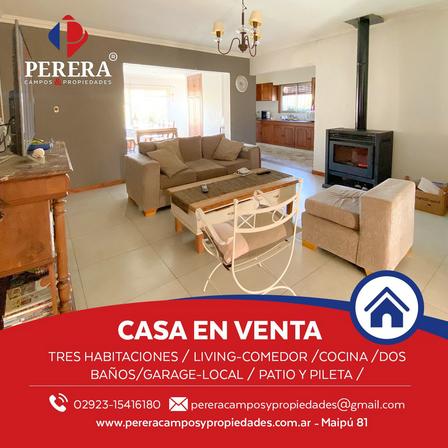 Se trata de un inmueble que tiene tres habitaciones, living – comedor, cocina, dos baños, lavadero, garaje / local, y patio con pileta.