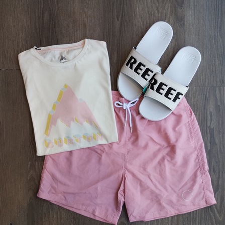 Promocionan sus shorts de baño, ojotas, remeras, y bermudas para estos días de calor.