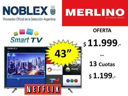 Merlino tiene un TV Smart Noblex 43'' a 11.999 pesos o en 13 cuotas de 1.199 pesos.