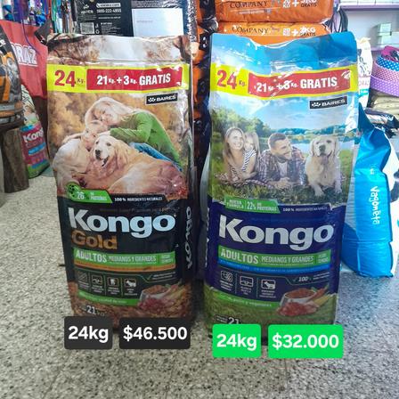 La bolsa de alimentos balanceados para perro, Kongo Gold, de 24 kilos, está a 46.500 pesos, mientras que, los 24 kilos de Kongo salen 32.000 pesos.