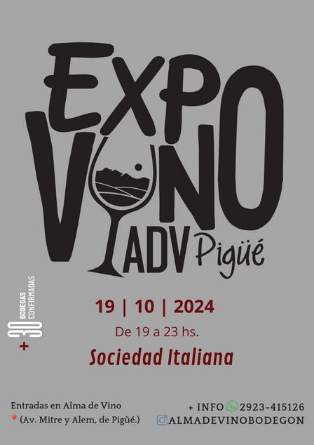 Más de 30 bodegas confirmadas estarán presentes, en la Sociedad Italiana de Pigüé, el día 19 de octubre de 2024, a partir de las 19.00 horas, contando con la participación de artistas invitados.