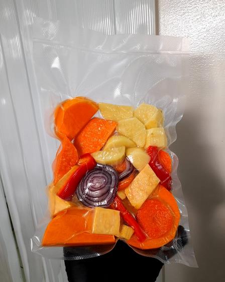 Son verduras, envasadas al vacío, de a 500 gramos, listas para cocinar al horno, contando con una selección de papas, batatas, boniato, zapallo, zanahoria, cebolla morada y morrón.