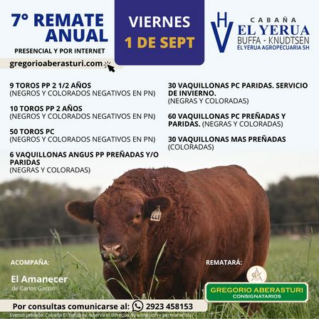 La Cabaña El Yerua, está ubicada en el kilómetro 77 de la Ruta Provincial 102, en el Establecimiento El Encuentro, de Cohelo, Provincia de La Pampa, y para su remate anual es posible realizar consultas a través del 2923 45 81 53 con la casa consignataria Gregorio Aberasturi.