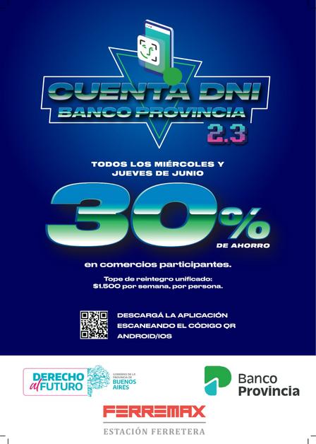 Hay descuentos del 30 por ciento, miércoles y jueves, en Ferremax, con Cuenta DNI, y tope de reintegro de 1.500 pesos por persona.