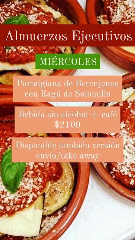 Fuego Sagrado Restaurant cocina hoy, miércoles, al mediodía, parmigiana de berenjenas con ragú de solomillo, bebida sin alcohol, y café por 2.100 pesos.