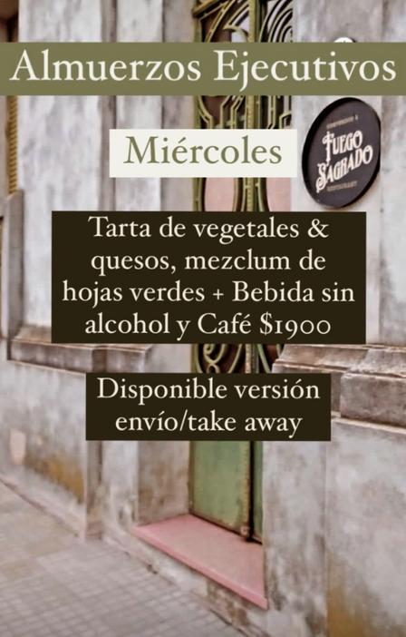Fuego Sagrado Restaurant cocina tarta de vegetales y quesos, mezclum de hojas, más bebida sin alcohol, más café a 1.000 pesos.