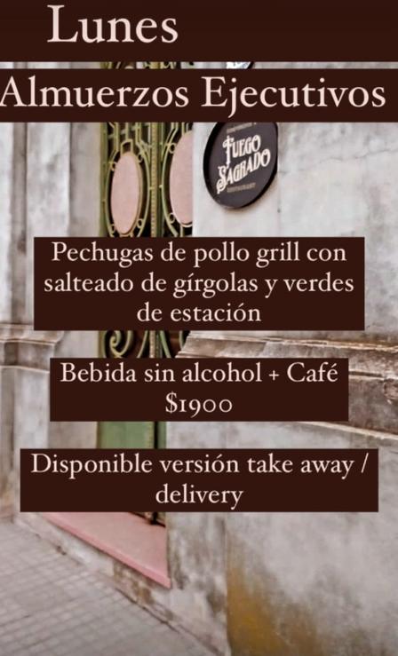 Fuego Sagrado Restaurant prepara, para hoy, lunes, pechugas de pollo grill, con salteado de gírgolas y verdes de estación, más bebidas sin alcohol y café por 1.900 pesos.
