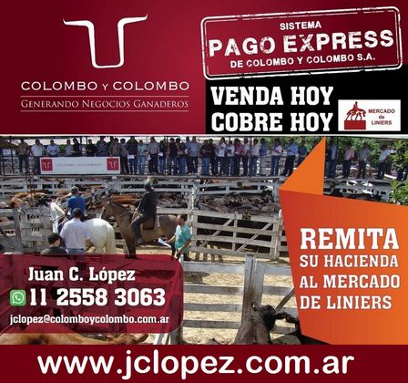 El mensaje comercial expresa que "en el Mercado de Liniers venda con plazo y cobre de contado con el sistema Pago Express de Colombo y Colombo.