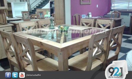 El modelo Cruz en pino macizo cuenta con una mesa de 1.30 por 1.30 metros que tiene tapa de vidrio y viene acompañada de 8 sillas.