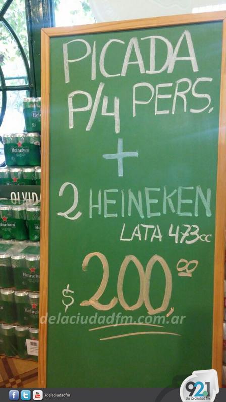Para hoy la picada para 4 personas más 2 latas de cerveza Heineken de 473 cc. cuesta 200 pesos.