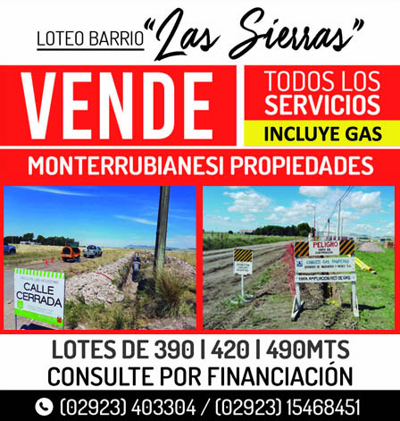 Las consultas, por financiación, pueden realizarse en Monterrubianesi Propiedades llamando al 40 - 33 - 04.