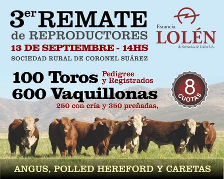 La Estancia Lolén está preparando el tercer remate de reproductores para el 13 de septiembre, a las 14.00 horas, en la Sociedad Rural de Coronel Suárez.