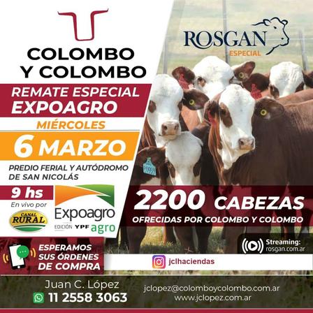 Mañana saldrán a venta 24.000 cabezas en Rosgan Expoagro, con 2.200 ofrecidas por Colombo y Colombo. Habrá financiación especial con las tarjetas rurales. El remate será presencial desde Expoagro y en vivo por Canal Rural a partir de las 9.00 horas.