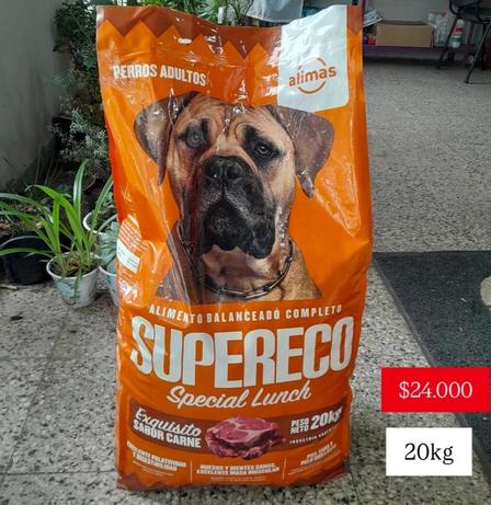 El alimento balanceado completo Supereco, sabor carne, de 20 kilos, cuesta 24.000 pesos para perros adultos.