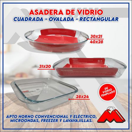 Asaderas de vidrio cuadradas, ovaladas y rectangulares aptas para hornos, freezers y lavavajillas pueden hallarse en Megacompras.